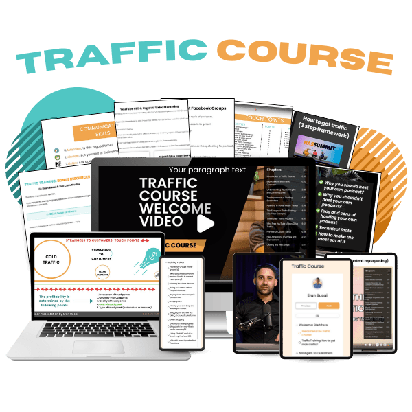 • Traffic Course: I have tried multiple traffic strategies over the years. This is the one place where I share my insights from A to Z on this topic. Pitfalls to avoid, how to find collaborations, how to get your first customers, how to grow an email list, how to get attention, how to get referrals, how to build relationships, and so much more. Want more traffic? This is the course for you.